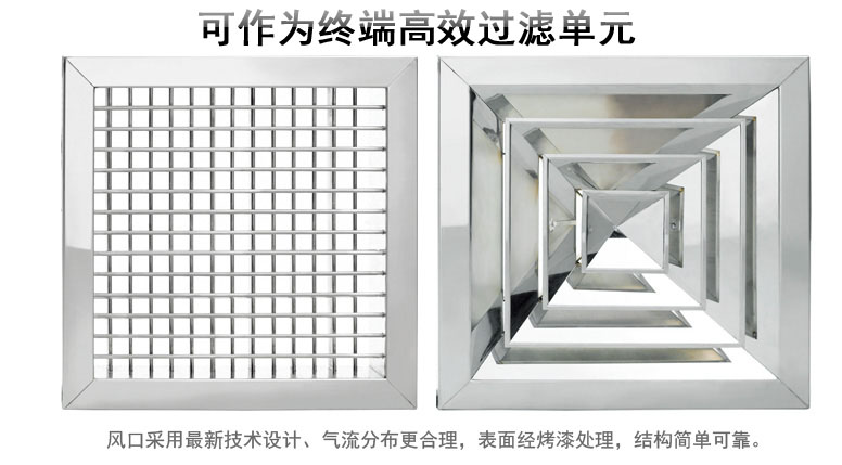 風口采用最新技術設計、使氣流分布更合理,箱體采用優質不銹鋼板或冷軋鋼板制作,表面經烤漆處理,結構簡單可靠,其中高效送風口可作為終端高效過濾單元直接置于各個級別的潔凈室吊頂等。