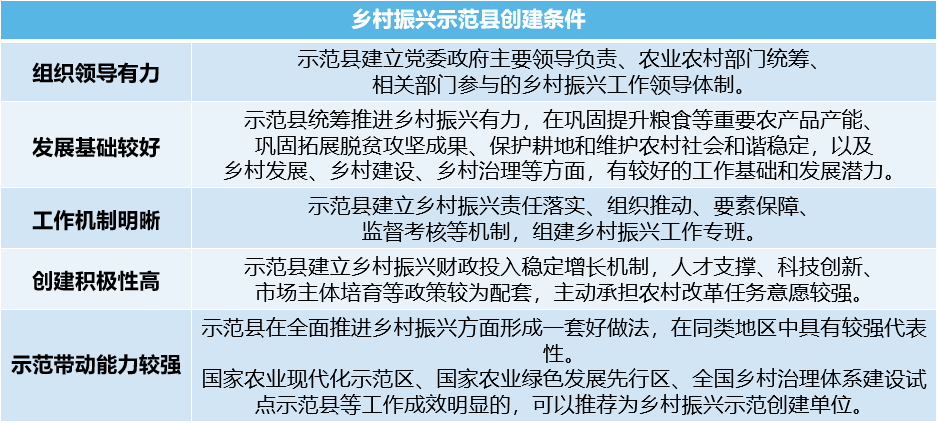 明確提出力爭(zhēng)用5年左右時(shí)間,開展創(chuàng)建工作的國家鄉(xiāng)村振興示范縣基本覆蓋全國各市(地、州、盟),可見,國家對(duì)此次鄉(xiāng)村振興示范區(qū)域打造的決心。